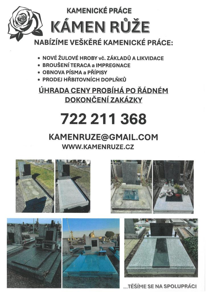 Dovolujeme si Vás informovat, že v sobotu 28.2.2026 v čase 11:40 - 12:00 budou pracovníci kamenických služeb na hřbitově v naší obci.