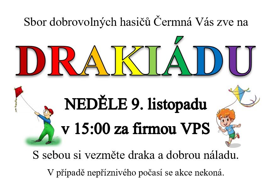 Hasiči Čermná Vás zvou v neděli, 9.11.2025 na DRAKIÁDU, která se koná od 15:00 hodin na louce za firmou VPS v Čermné ve Slezsku. Za nepříznivého počasí se akce nekoná.
