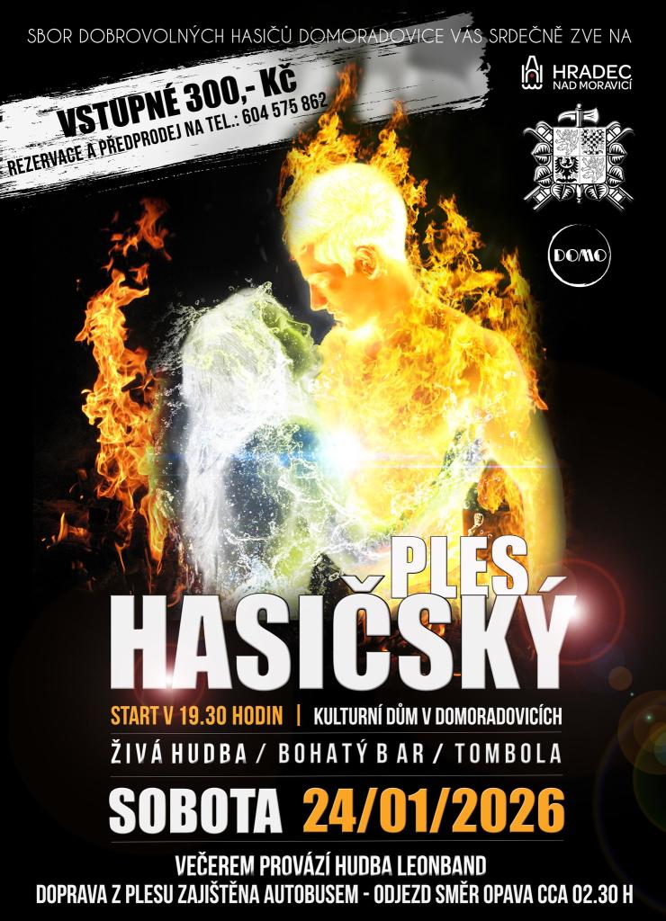 SDH Domoradovice zve na hasičský ples v kulturním domě. K tanci a poslechu zahraje kapela Leon Band. Na místě bude možnost dokoupení večeře. Zpáteční doprava do Opavy je zajištěna ve 2.30 h. Rezervace na tel. 604 575 862.