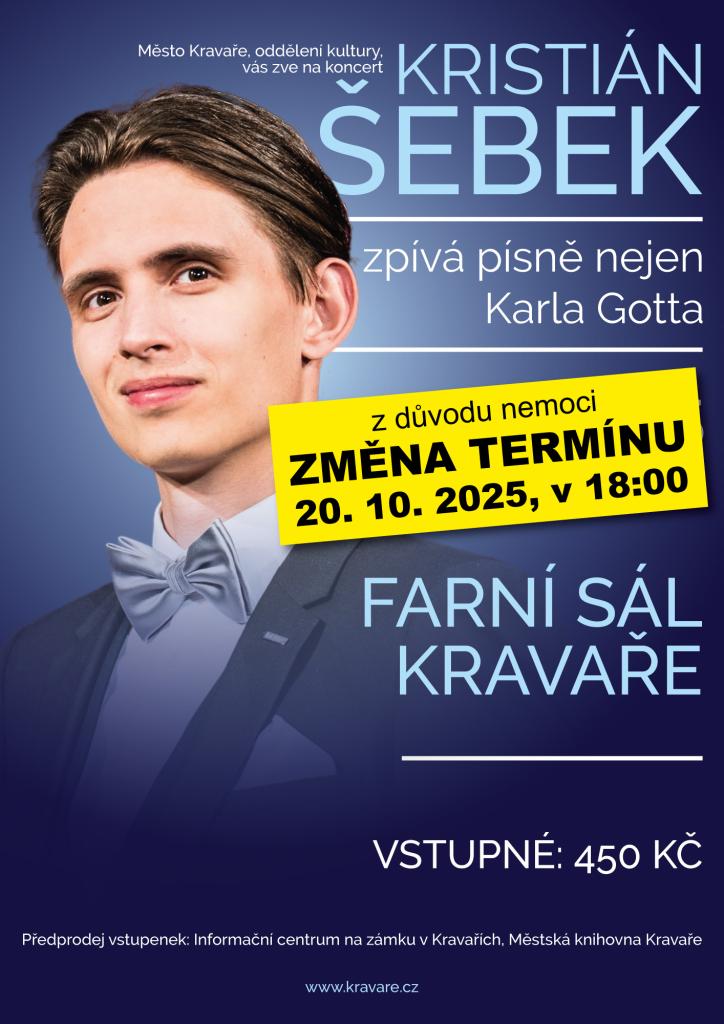 Město Kravaře, oddělení kultury zve na koncert Kristiána Šebka. Z důvodu nemoci se koncert uskuteční 20. 10. 2025 v 18.00 h.