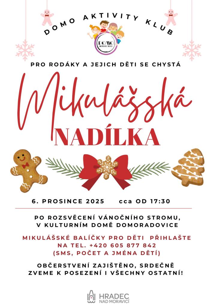 Domo Aktivity Klub zve na mikulášskou nadílku po rozsvícení vánočního stromu. Mikulášské balíčky pro děti hlaste SMS na tel. čísle 605 877 842 (uveďte počet a jména dětí). Občerstvení zajištěno.