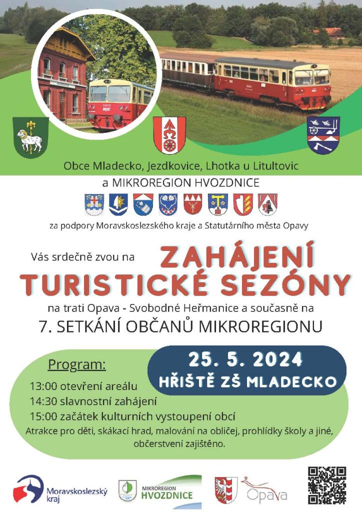 Obce Mladecko, Jezdkovice, Lhotka u Litultovic a Mikroregion Hvozdnice za podpory Moravskoslezského kraje a Statutárního města Opavy Vás srdečně zvou na Zahájení turistické sezóny na trati Opava - Svobodné Heřmanice a současně na 7. setkání občanů mikroregionu 25.5.2024 na hřiště ZŠ Mladecko.