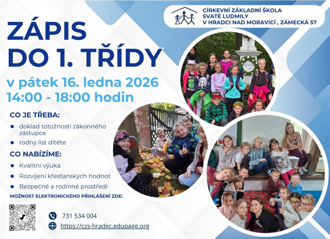 Pro zápis do 1. třídy si vezměte s sebou doklad totožnosti zákonného zástupce a rodný list dítěte. Pro více informací volejte na tel. číslo 731 534 004.